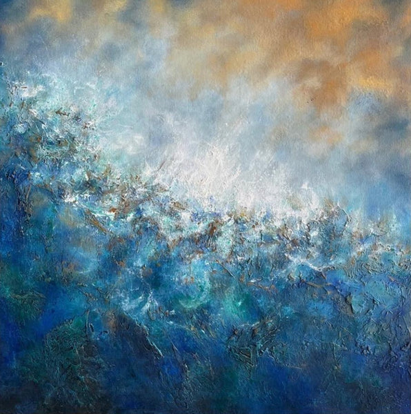 My flowerscapes are influenced by my passion for India, the chaos, the colours, and textures. I use of the metallic paints my work to help to create a bit of drama and movement, changing with the natural light of the day. My latest collections feature seascapes and abstract landscapes, exploring movement, freedom, and serenity.