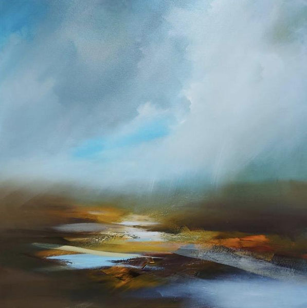 Using oil as his choice of medium, he manipulates the paint with palette knife and brushes to build depth and atmosphere into his work, that reflect the dramatic weather conditions he enjoys painting. His work described by many has having a spiritual and mystic quality that leaves the viewer to establish an horizon and to engage in the semi abstract forms that fuse together making the landscape come to life.