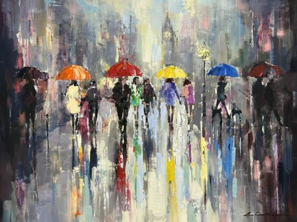 Ewas work lies somewhere between Abstract and Impressionism, gesturing at shapes and figures while capturing light and reflections with loose brush strokes. Her work is often heavily textured with bright colours and demonstrates fantastic depth.