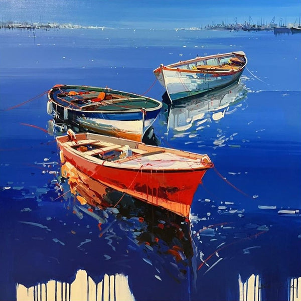 Santana may create beautiful paintings of primarily moored boats in low tide or beaches, but his approach to light and water are just as much of a focal point. By manipulating colours and using dynamic brushstrokes, Santana creates not only a tranquil work but a bright and vibrant world.