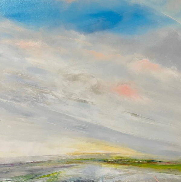 Influenced by Dutch artist Jacob van Ruisdael’s study of cloudscapes, and the vastness of Thomas Cole’s canvases, Joanna endeavours to capture the intricacy of light spilling from clouds in her own work. Her canvases utilise a 70:30 ratio, magnifying the moment the landscape meets the horizon, and offering an atmospheric perspective on the vastness of nature and the insignificance of self. Paint is expressively blended to create depth and texture, whilst her natural ability to use colour floods her canvases with light and life, fusing serenity and drama to stunning effect.